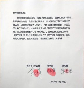 世界佛教总部今天收到了李云峰等三位佛弟子的来信,原文如下: